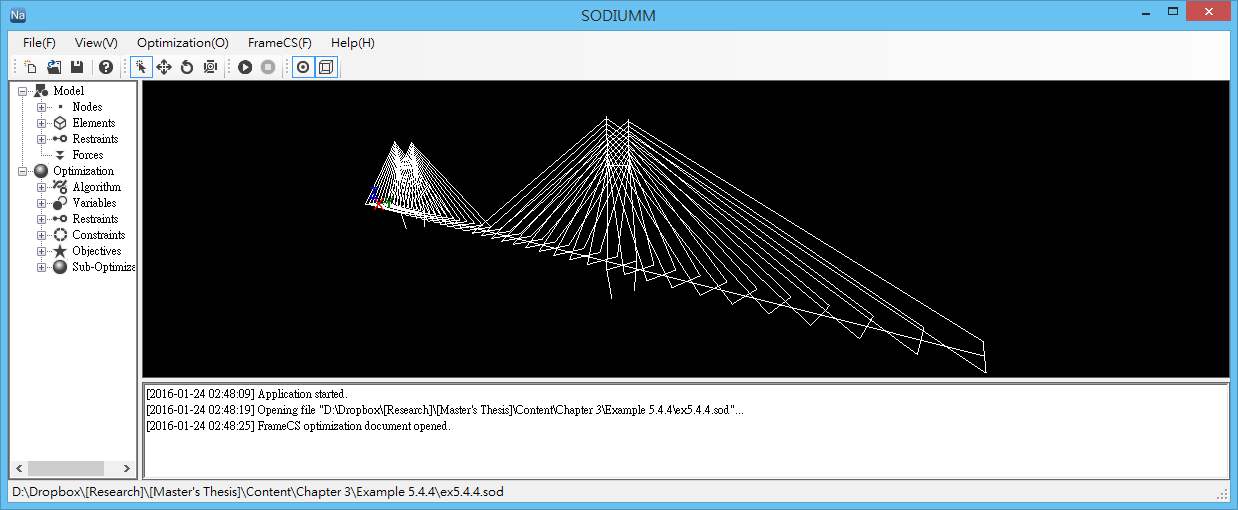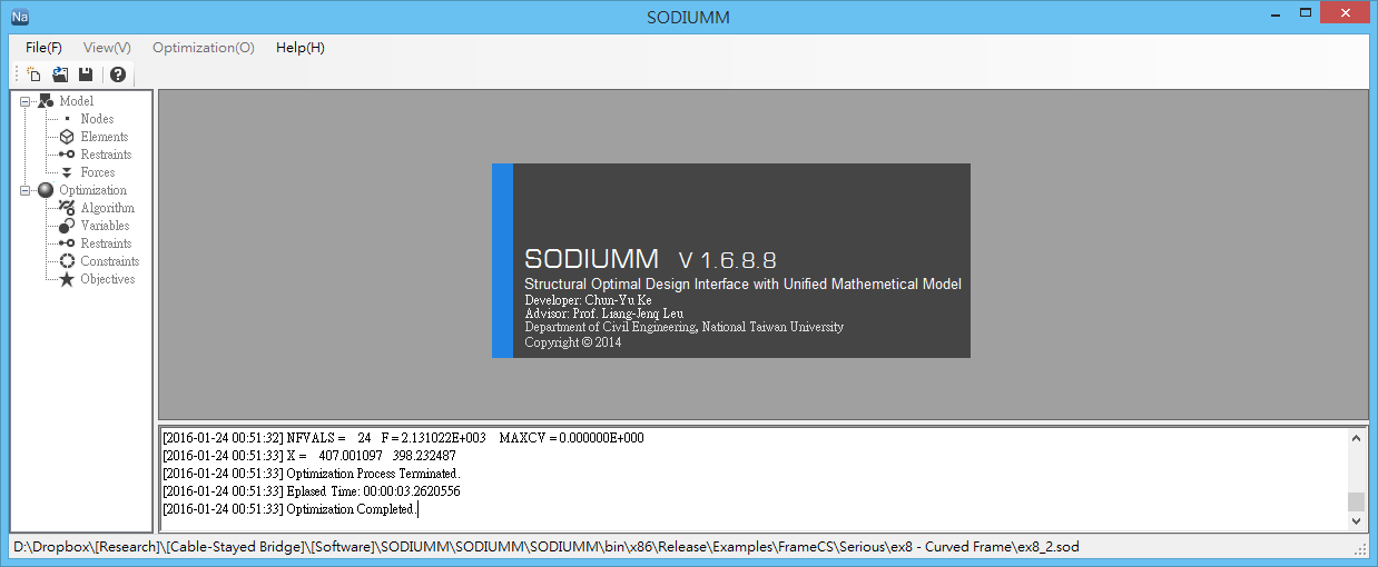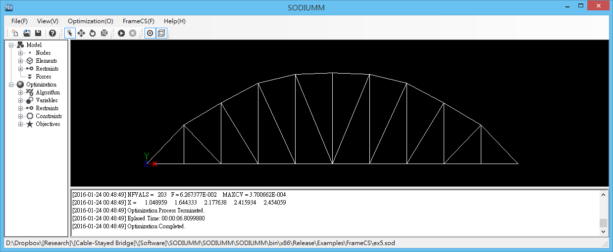 SODIUMM is a structure optimal design software with GUI that shows real-time optimization process of the structure. It adopts numerous optimization algorithms and adapts several commercial structural analysis software, such as SAP2000, into a unified platform that is meant for multi-level optimization process and has several handy features such as text defined functions and Lagrange interpolations.